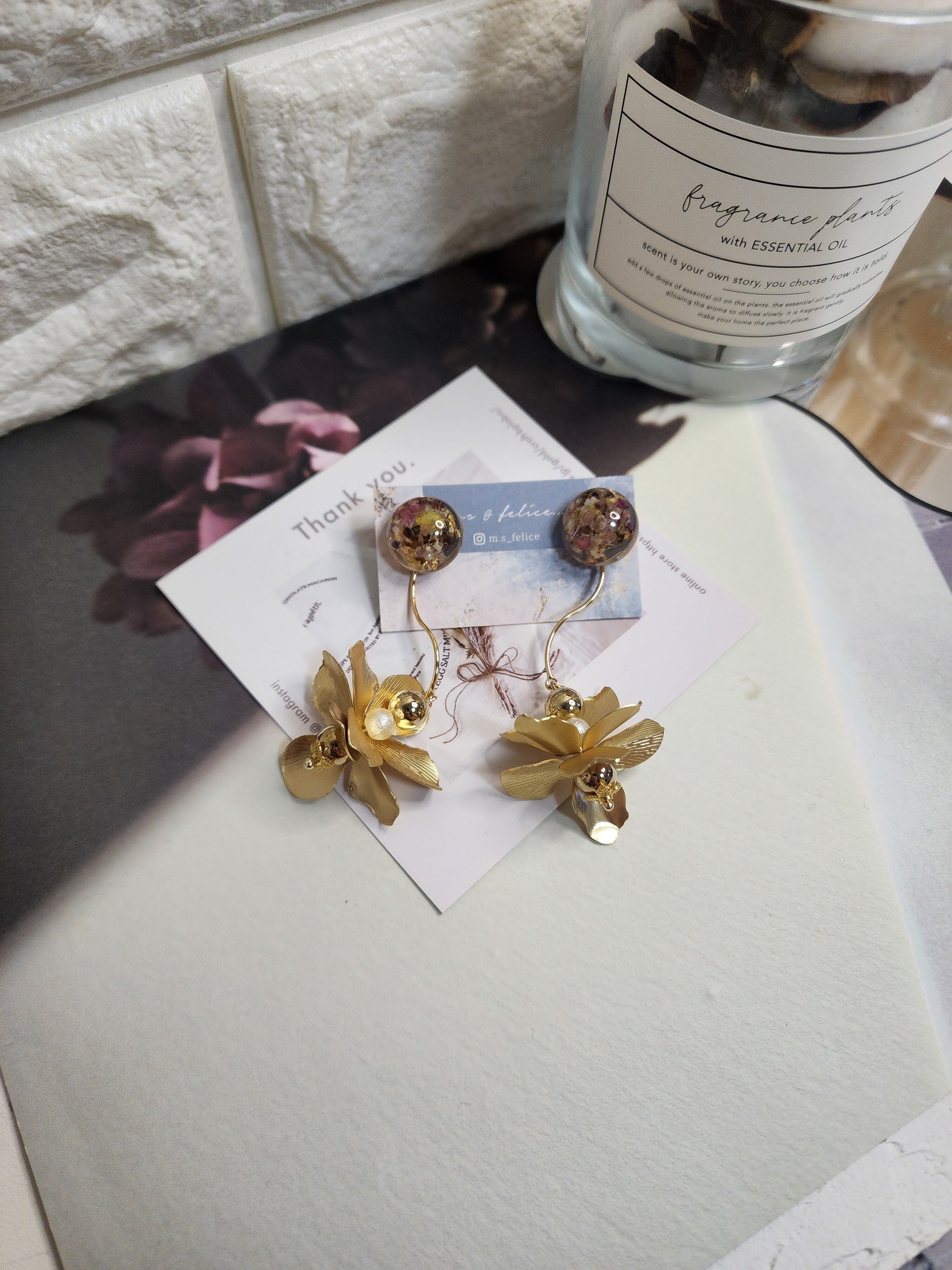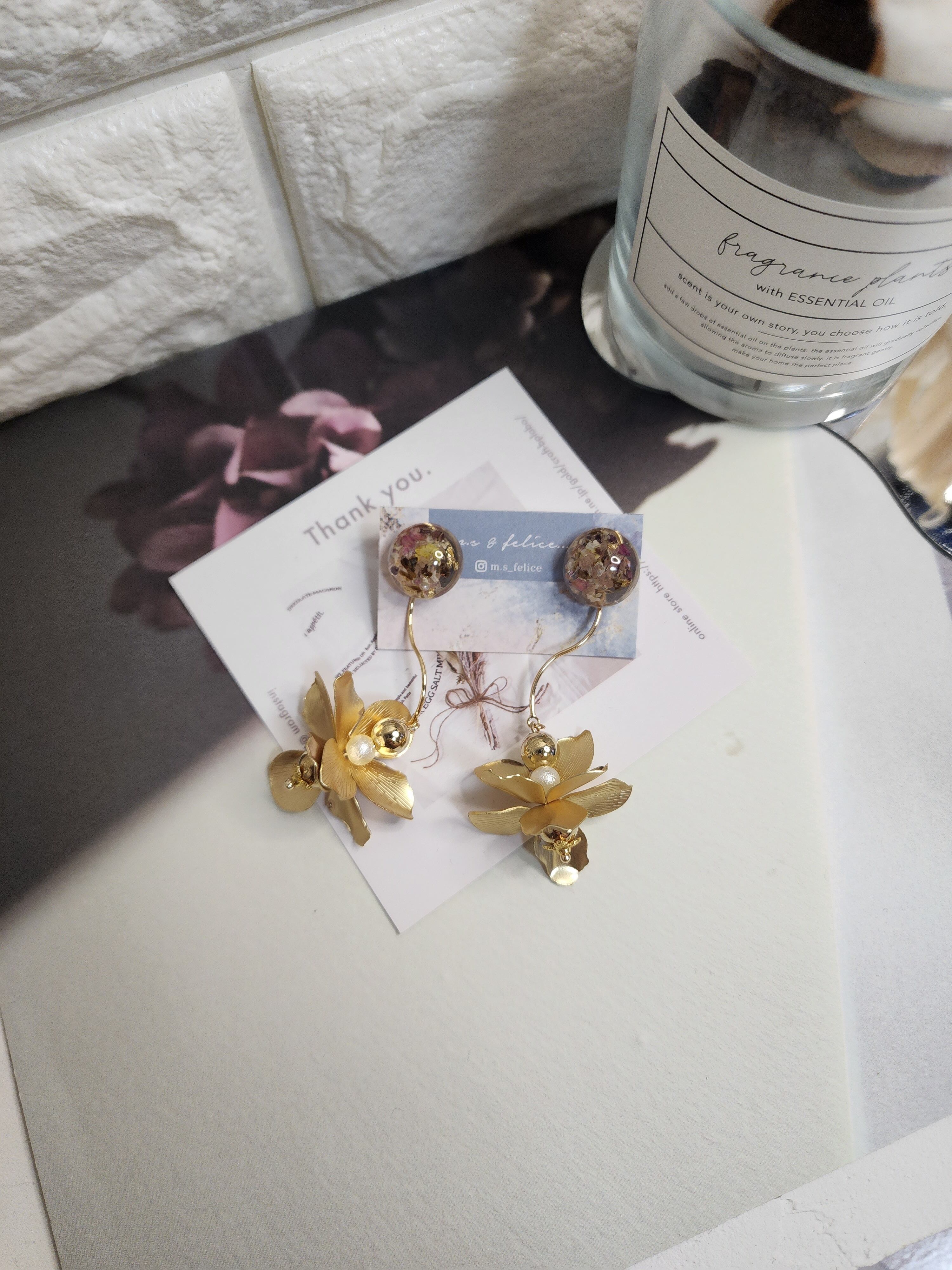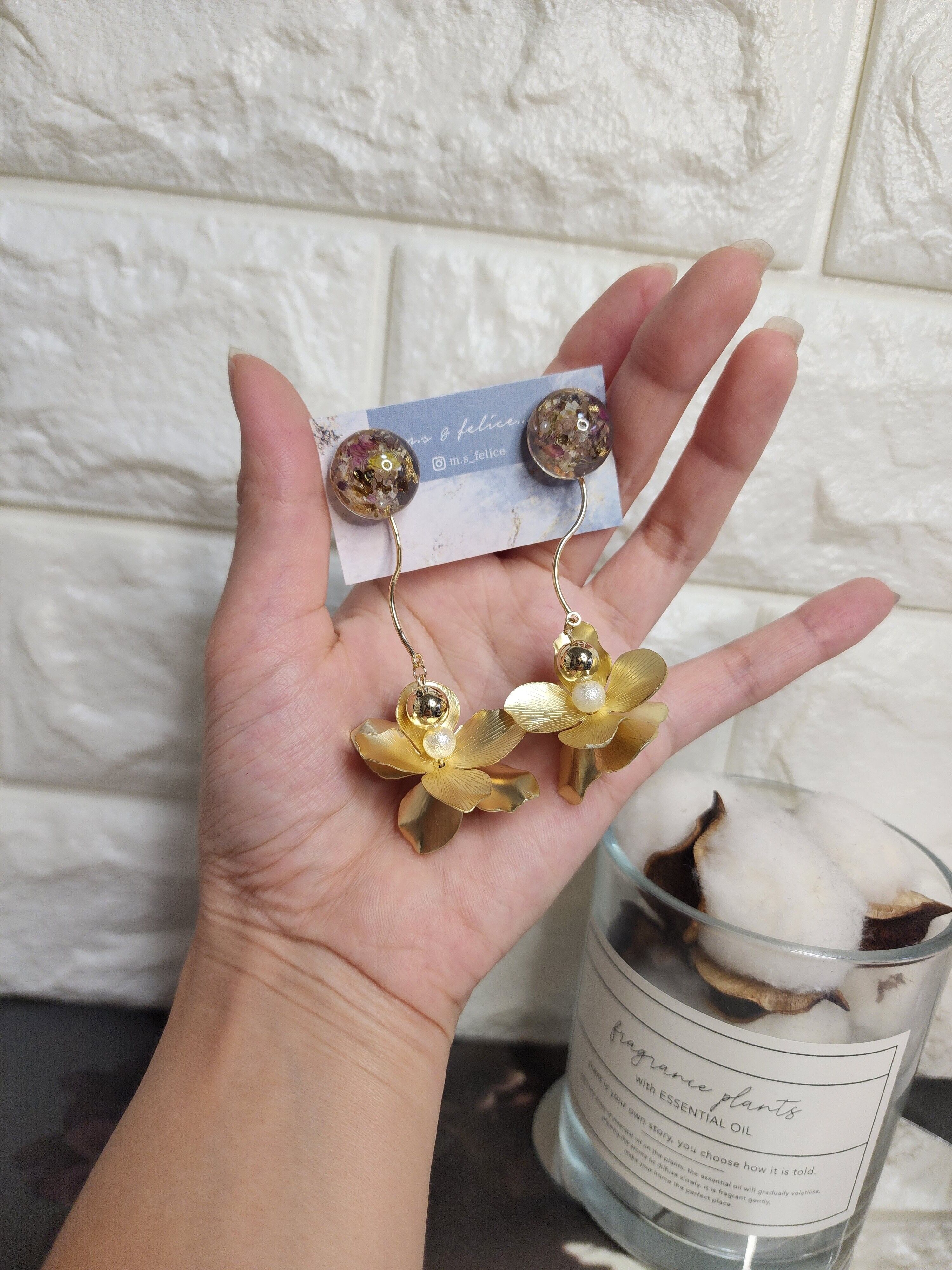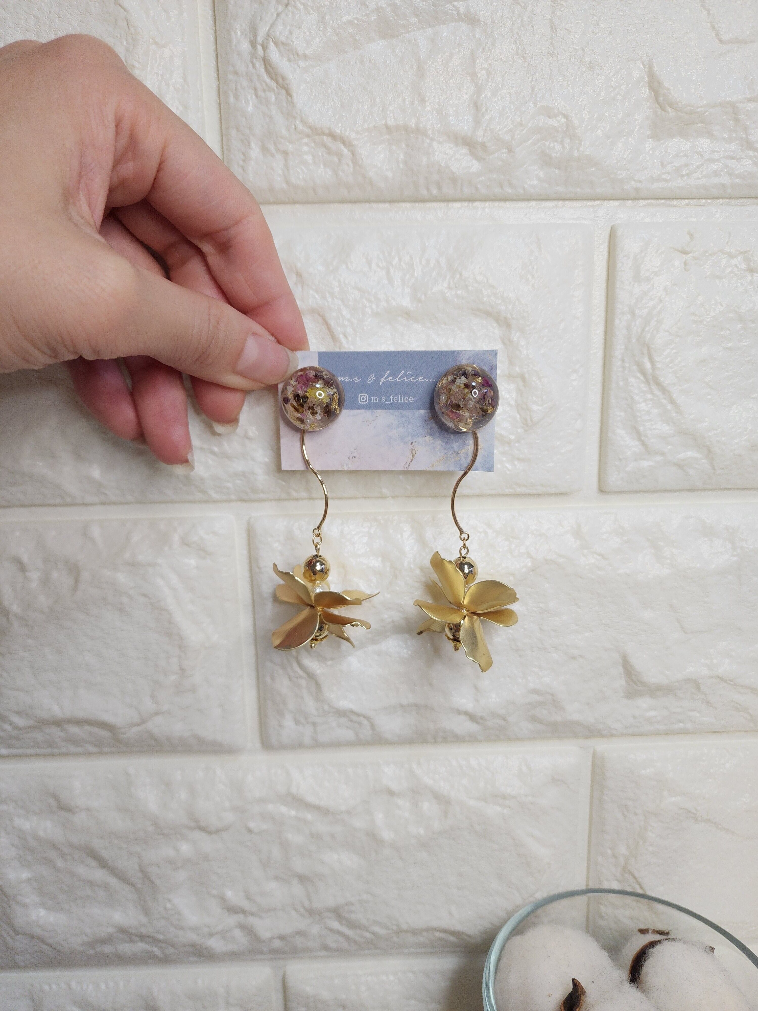 ・イヤリング・ピアスなど左右が完全に同じになるデザインはございません。レジン特有のデザインひとつひとつの個性とハンドメイドならではの風合いをお楽しみください。
